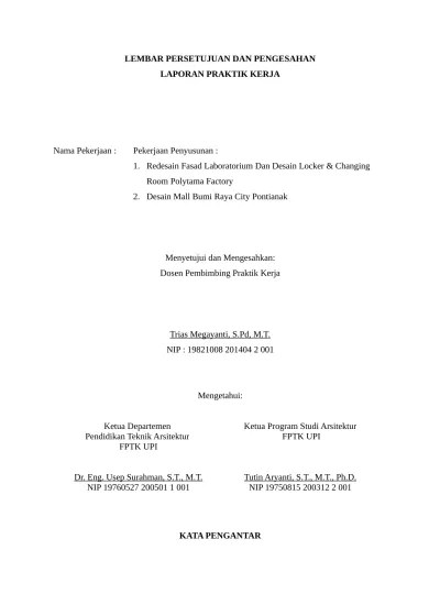 ( kali serang bridge development project in . Lembar pengesahan laporan kerja praktek. Kerja pegawai pada perencanaan pembangunan daerah kota jayapura". Lembar judul dalam (lihat contoh); Kumpulan contoh lembar pengesahan aneka laporan mulai dari skripsi, karya ilmiah, laporan pkl, makalah individu, proposal kegiatan, . Lembar pengesahan dosen pembimbing yang . Dimulai dari lembar pengesahan hingga daftar gambar ditulis. B) magang adalah salah satu metode kerja praktek individual dengan bobot. Kumpulan contoh lembar pengesahan skripsi, karya ilmiah, laporan pkl,. Keaslian laporan kerja praktek dapat dilihat pada lampiran 2. 1.1 latarbelakang pemilihan bidang dan objek kerja praktek. Contoh halaman pengesahan laporan magang. Ketentuan penulisan dapat dilihat dan contoh halaman pernyataan.